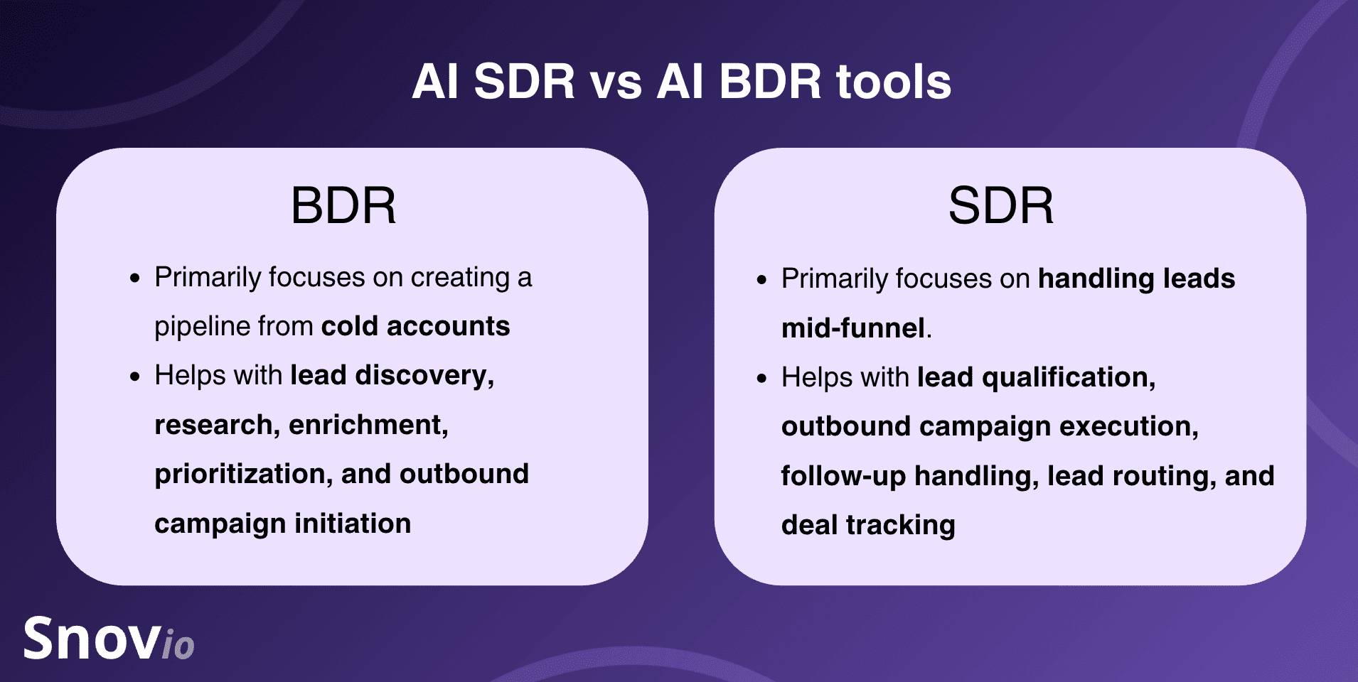Both types of software overlap significantly, so companies sometimes opt for one solution over the other. Still, if I were to get technical, I’d summarize their differences like this: “AI BDRs handle the top of the funnel, while SDRs are more focused on moving leads through the middle”.