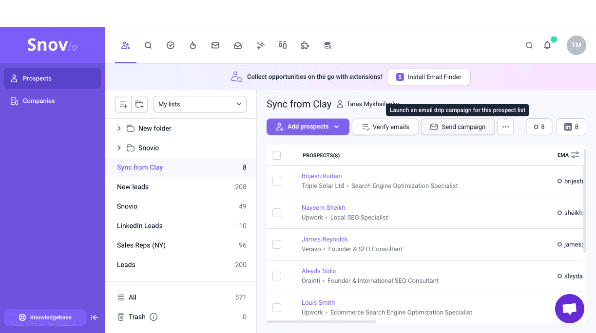Snov.io is one of the best AI business development representative tools on the market, combining powerful lead generation with outreach capabilities. Its AI capabilities help teams build high-quality lead lists, analyze prospect interest levels, create ideal customer profiles, plus personalize outreach across email and LinkedIn.