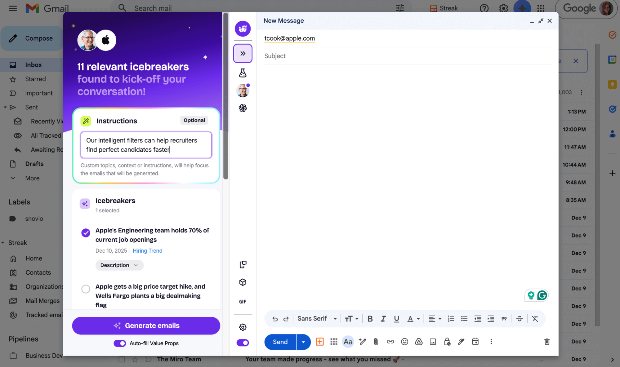 This allows sales teams to consistently personalize thousands of messages at scale using factual data instead of basic name or company inserts.