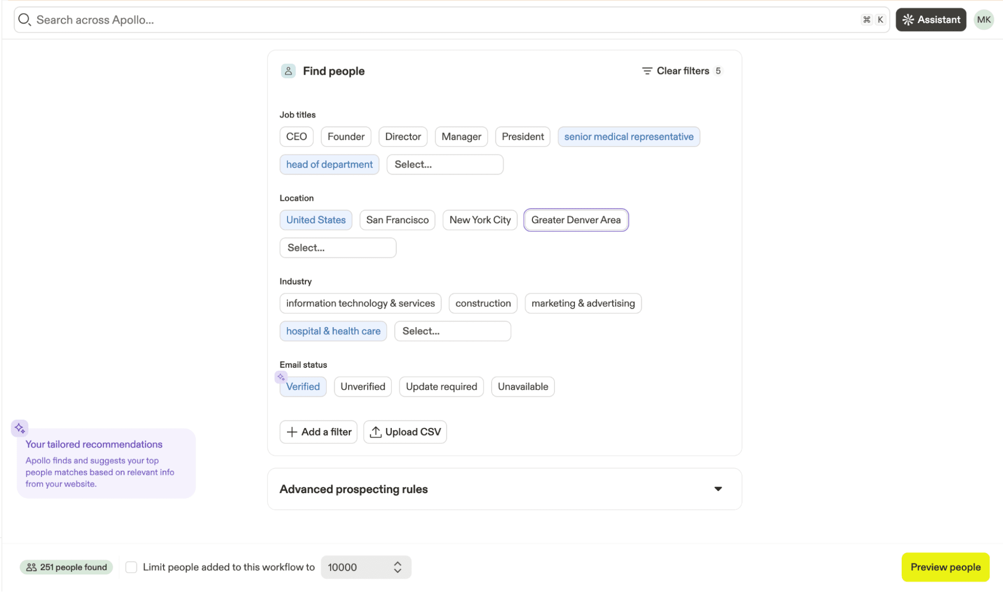 - Apollo.io is good for teams that need access to a large contact database with AI-powered filtering and scoring for high-volume prospecting.