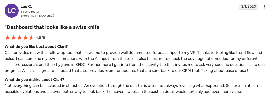 Clari is a solid revenue intelligence and forecasting platform for large sales organizations. Based on my research, its predictions are valuable; it unlocks better visibility into company workflows and surfaces deal risks early. All of this, of course, contributes to the organization’s success. Moreover, its customer support and security are also of the highest quality.