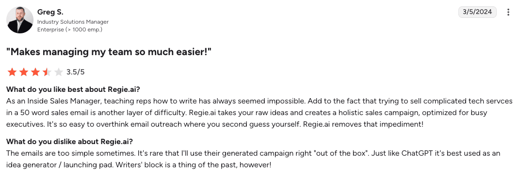 - Regie.ai works well for BDRs producing outbound copy at scale who need consistent messaging aligned with personas and funnel stages.
