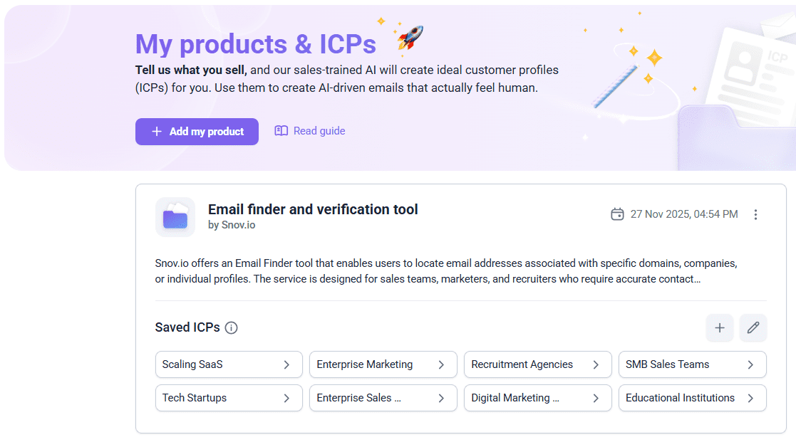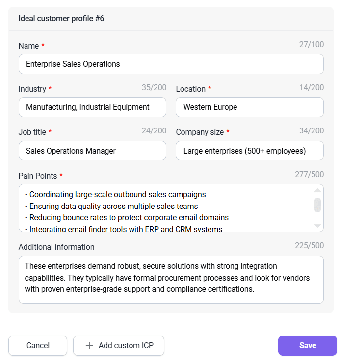 You can add one more ICP with each next generation, creating up to 24 unique customer profiles per product. Each ICP includes details, like industry, location, company size, job title, pain points, etc., making it easier to create more personalized cold outreach emails.
