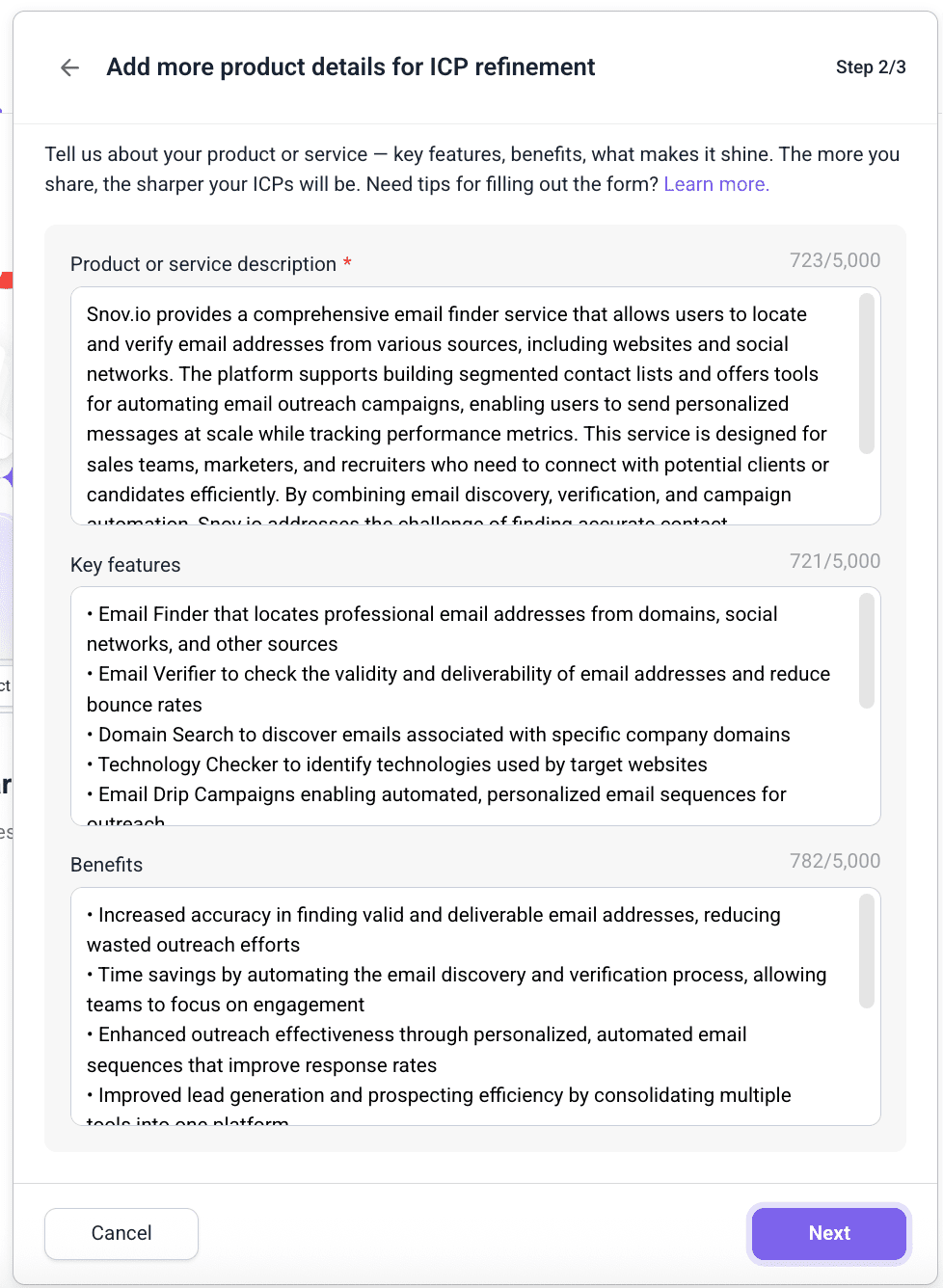 In my practice, descriptions generated by our AI sales agent are comprehensive and winning. However, just in case, review what it has prepared for you, make any necessary edits, and save your product to start generating ICPs.