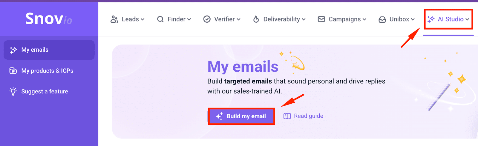 Once you’re done with your lead list, our AI cold outreach agent will help you prepare personalized cold outreach emails. To get started, go to the AI Studio tab and click “Build my email”.