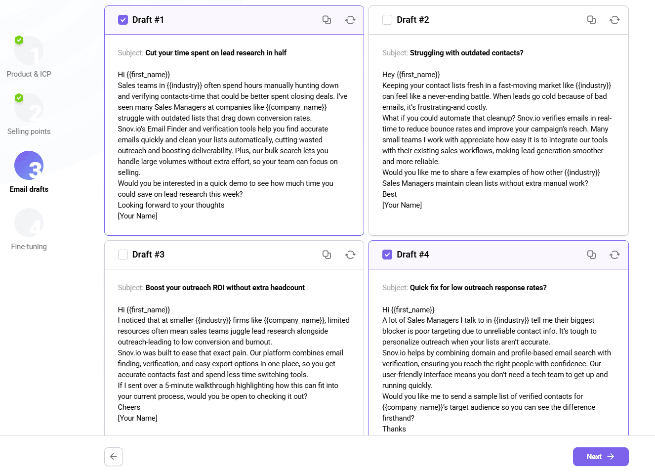 You can also edit AI-generated points, add your own ones, or ask our AI email agent to craft more offers – totally optional! Once you’re done with your inputs, click “Next” to get four message drafts generated.
