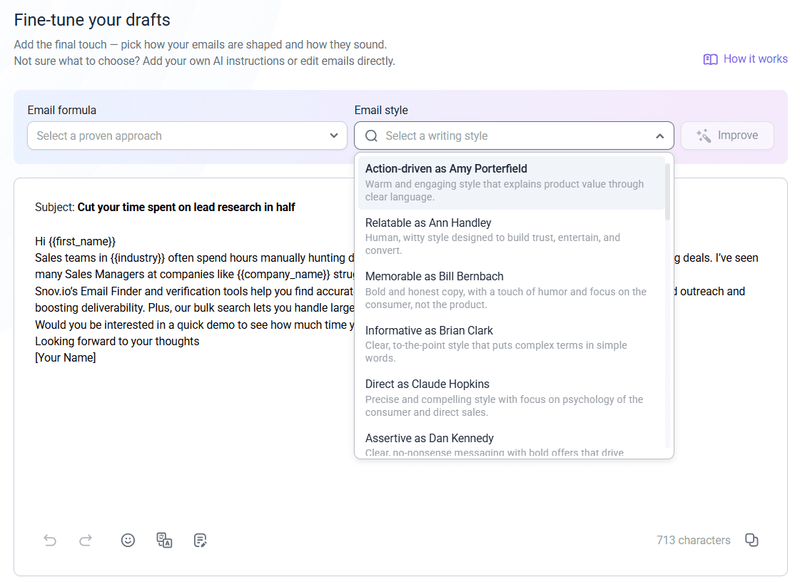You will definitely like how Snov.io’s AI Email Builder makes your draft more engaging in seconds. All you need to do is choose your preferences. Select the email formula that fits your goal, whether it’s to spark curiosity, start a meaningful conversation, or show how your solution solves customers’ pain points.