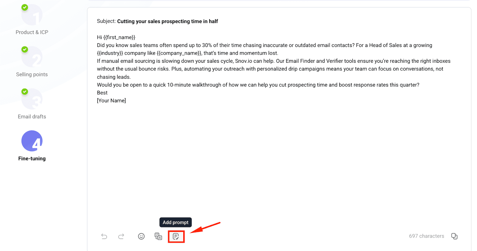Next, we moved to crafting personalized messages, which appeared to be the easiest step. In a few clicks, we received 4 personalized email drafts generated by Snov.io’s AI Email Builder. We chose one option that best reflects our target and repeated the same email-generation process for all 3 ICPs.