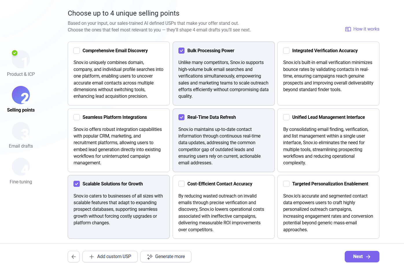 Once you choose the second option, our AI cold outreach agent will generate 9 unique selling points that will help make your emails more impactful. Pick up to 4 points that best reflect your product’s value to move forward.
