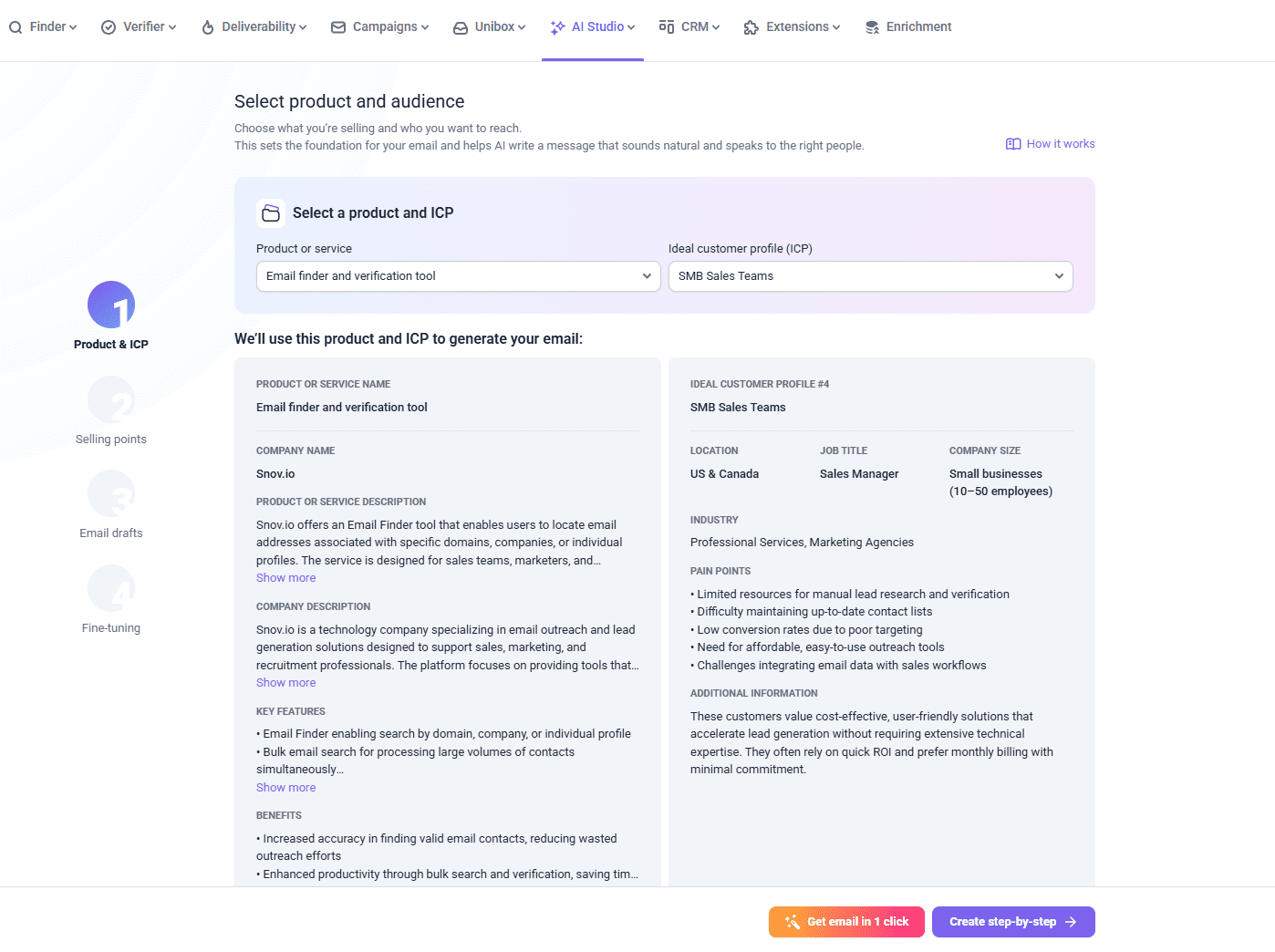 Now, all you need to do is select one of your products and ICPs, and our AI Email Builder will leverage every detail to turn descriptions into a clear offer and on-brand sales copy.