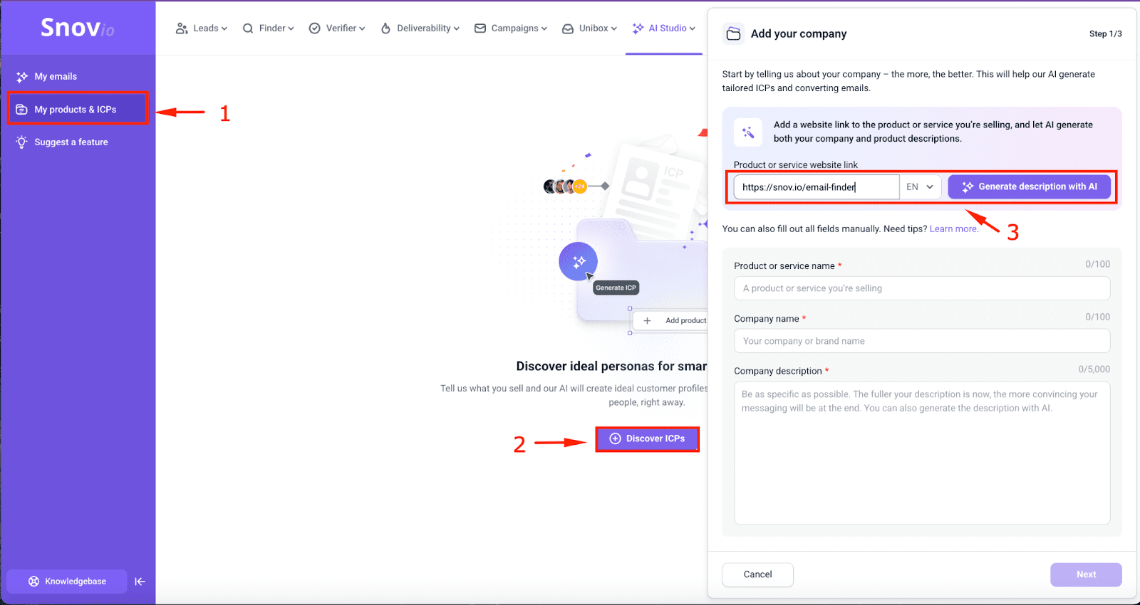 Now go to the My products & ICPs tab, click “Discover ICPs”, and provide the link to your product or service.