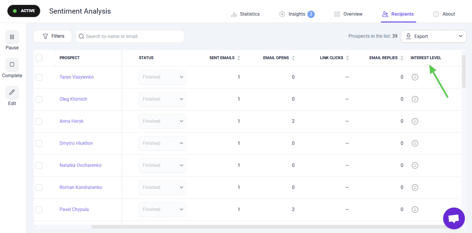 Once your campaign goes live, Snov.io’s AI cold outreach agent is ready to assist you with reply analysis as well. It provides Sentiment analysis to help you reveal interested prospects and focus your efforts on them.