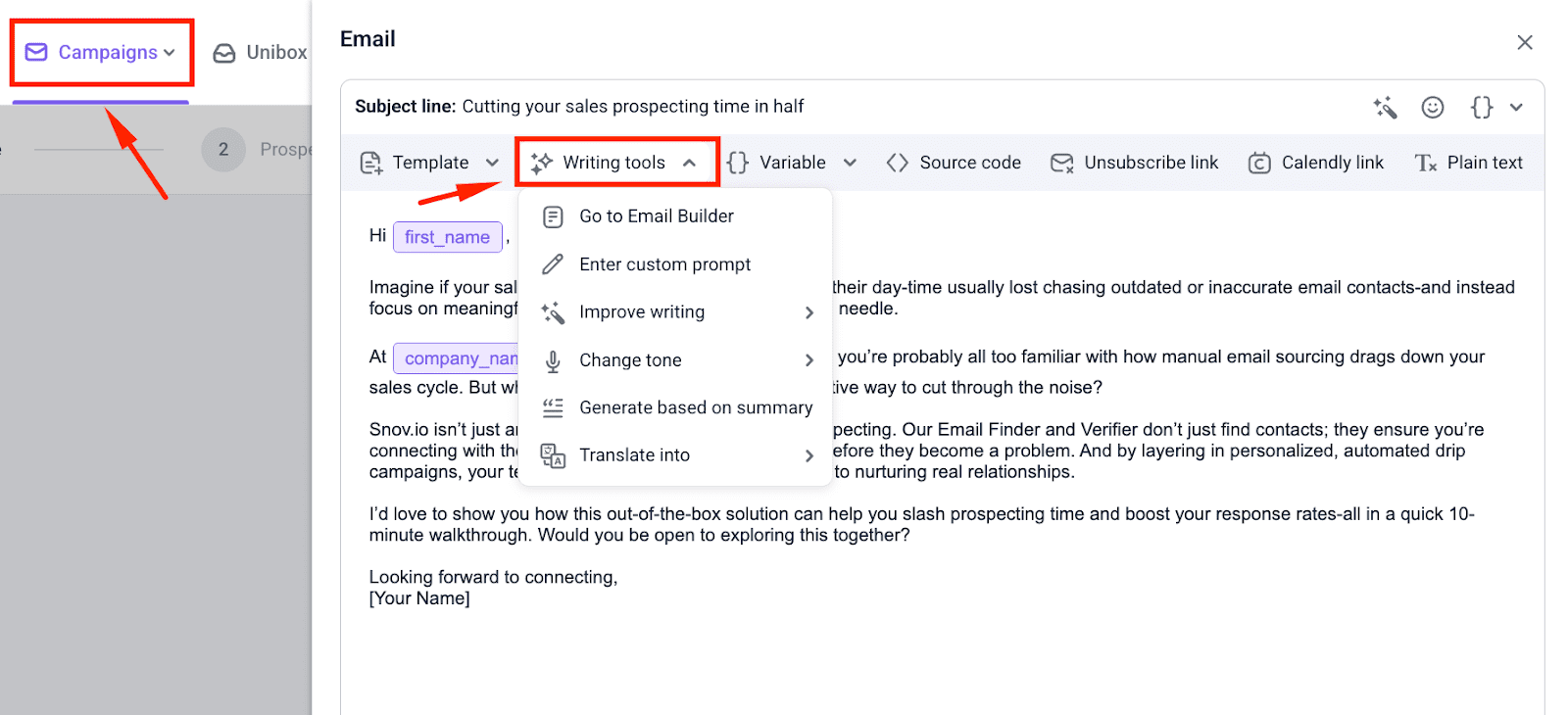 And no worries, if you suddenly realize you need more tweaks: Snov.io’s AI email agent stays with you throughout the setup process. Just go to the Campaigns tab, find the one where you use this email, open its draft, and select the “Writing tools” menu.