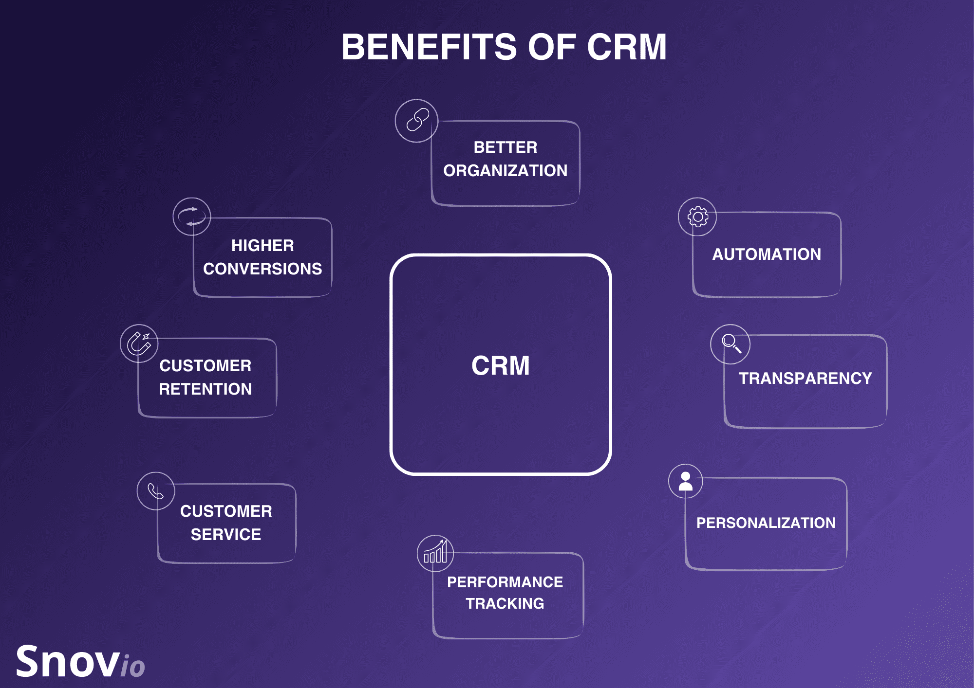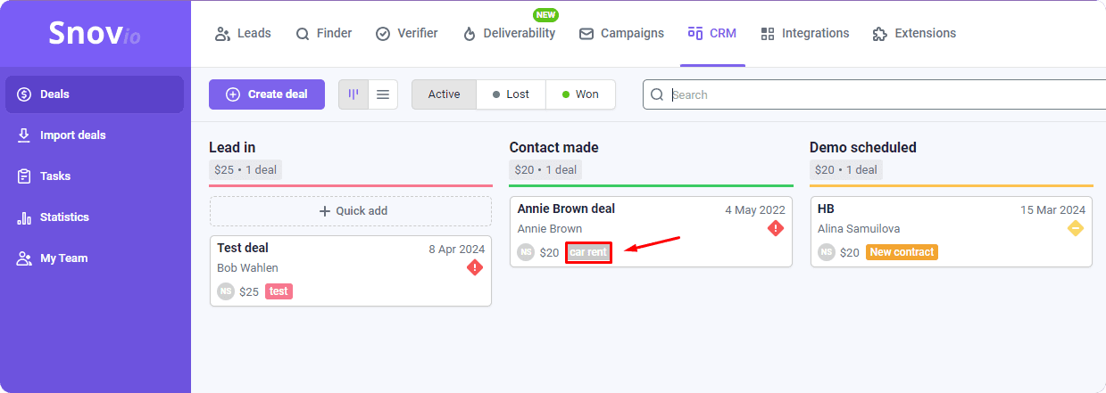Snov.io CRM helps manage all information about leads in one place, track their engagement, and share notes across marketing and sales teams.