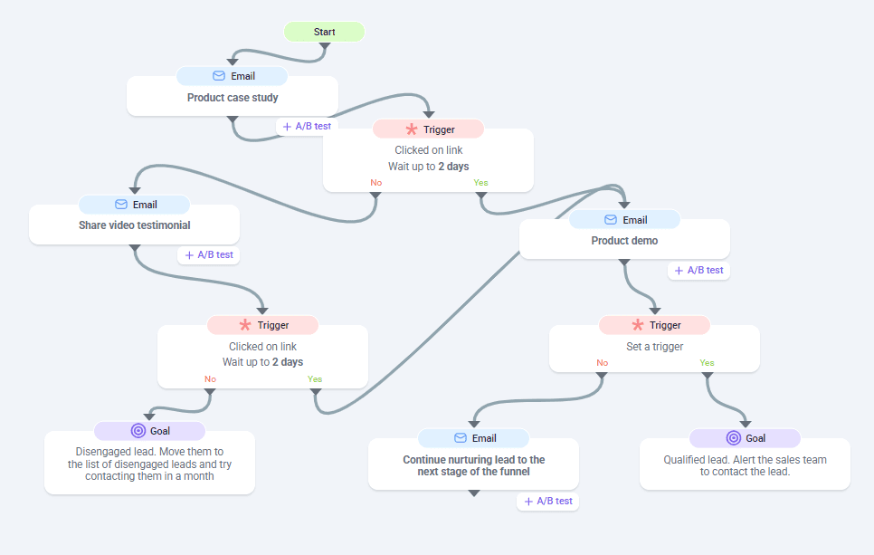 Now it’s time to start nurturing leads through regular automated email outreach. Share some industry-related tips, send invitations to your webinars, and onboard users who have just subscribed to your free trial — ideas for drip email campaigns are versatile.
