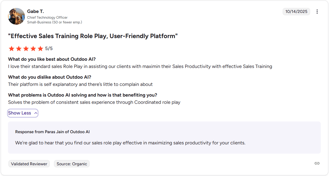 Users highlight how Outdoo speeds up onboarding and makes coaching more structured by tying practice directly to real calls and measurable execution.
