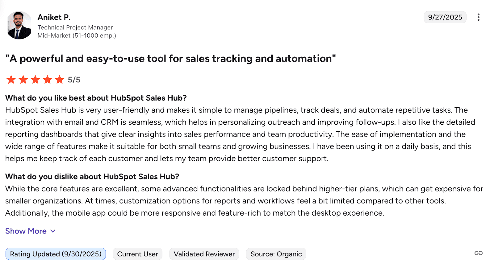 Users like HubSpot Sales Hub for keeping their entire sales process in one place. Some mention the initial setup takes time to get right.