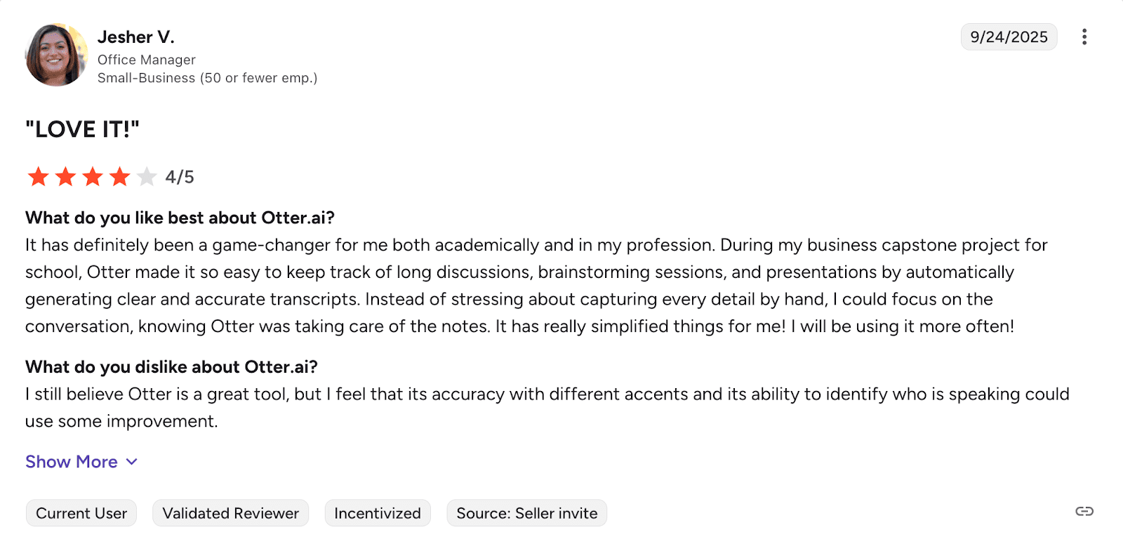 Users find Otter.ai valuable for automatically capturing meeting details, which helps them stay engaged in discussions. But some people note the tool struggles with overlapping voices in group settings or misinterprets words with heavy accents.