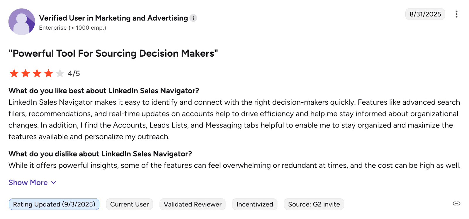 All in all, I believe Sales Navigator is worth considering if your prospects are actively engaged on LinkedIn and you need precise targeting. Its AI features genuinely enhance personalization. However, you need to weigh the cost against your actual usage.