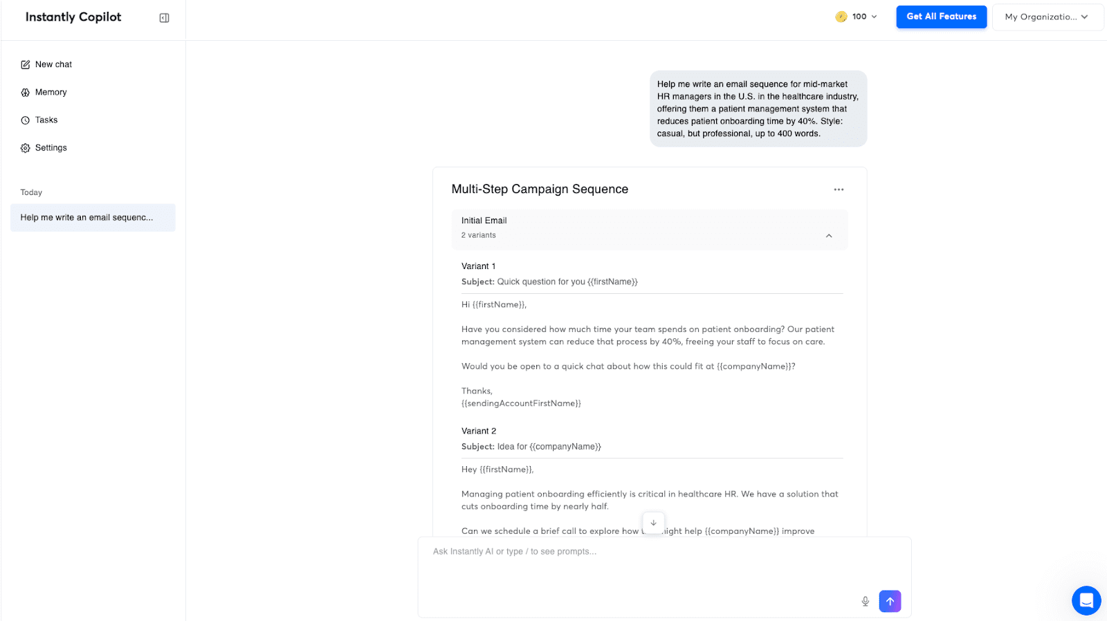 When using AI email writer tools like Instantly Copilot, don’t just type “Write a cold email for my SaaS.” Instead, specify: