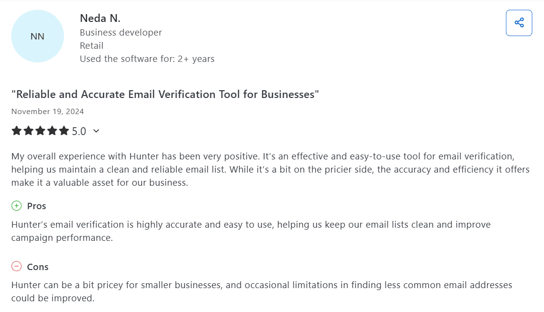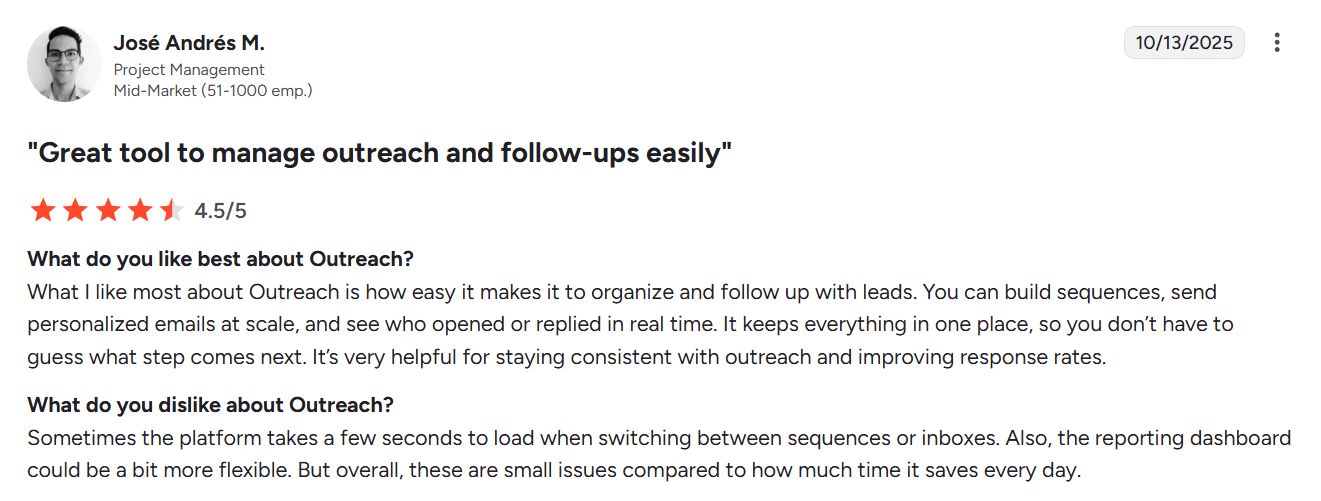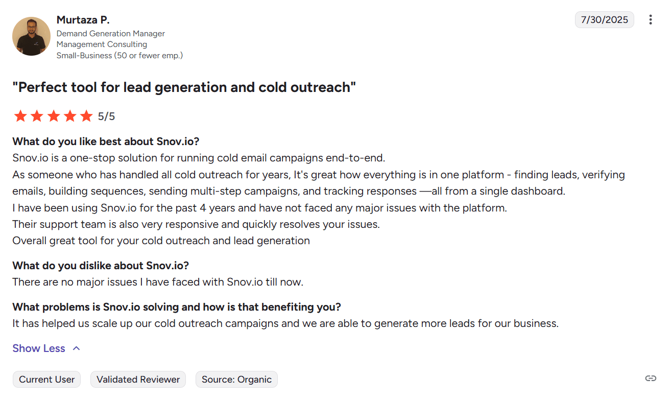 Users like having prospecting, email verification, and sales outreach tools in one place. Many also praise Snov.io’s support, noting that agents are very responsive and helpful.