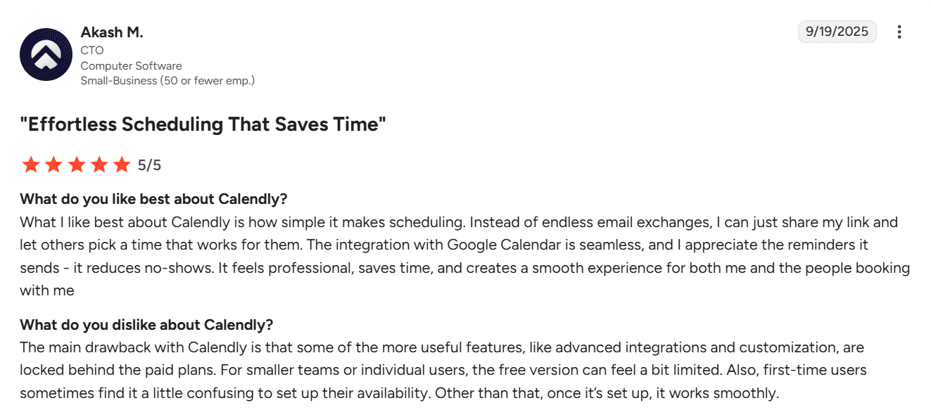 Users claim that the platform is very helpful for scheduling and significantly reduces back-and-forth. People also mention its ease of use and smooth integrations with popular calendars. But according to some reviews, many useful features are available only on higher plans.