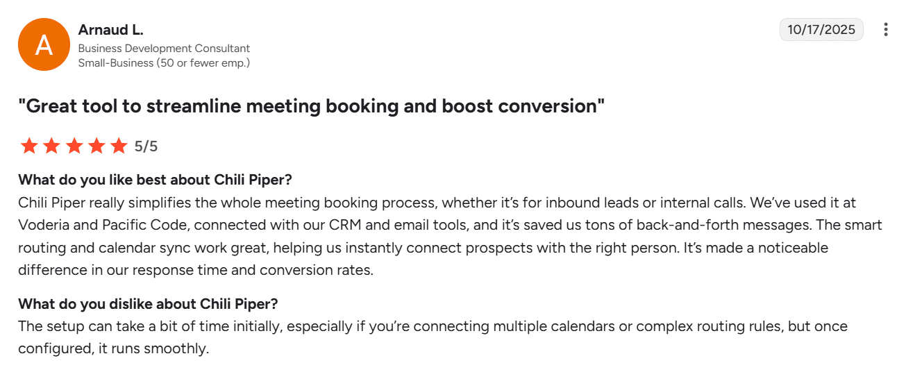 Users report that the platform simplifies meeting scheduling with automation and calendar integrations. Practitioners also praise Chili Piper’s advanced rules for contact forms, ensuring each lead is redirected to the correct rep.