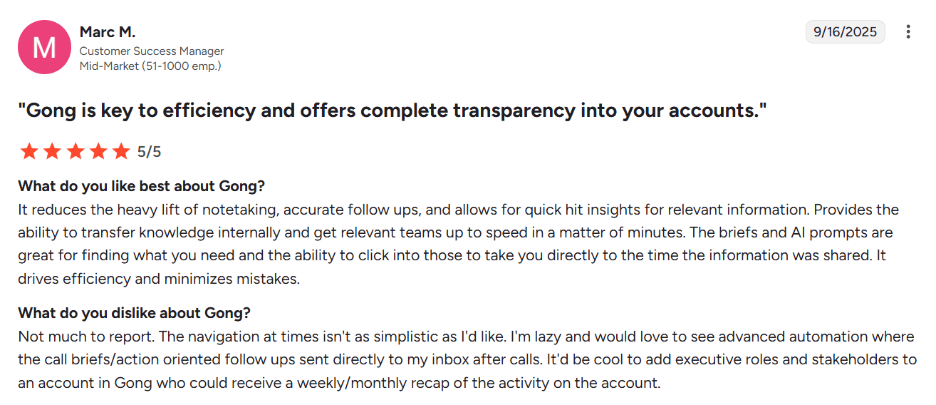 Users praise Gong for its powerful AI-driven insights, particularly for sales coaching, deal risk assessment, and capturing customer feedback. People also like its accurate call recording and transcripts, which make follow-ups faster. However, many report a steep learning curve and a fairly high price tag.