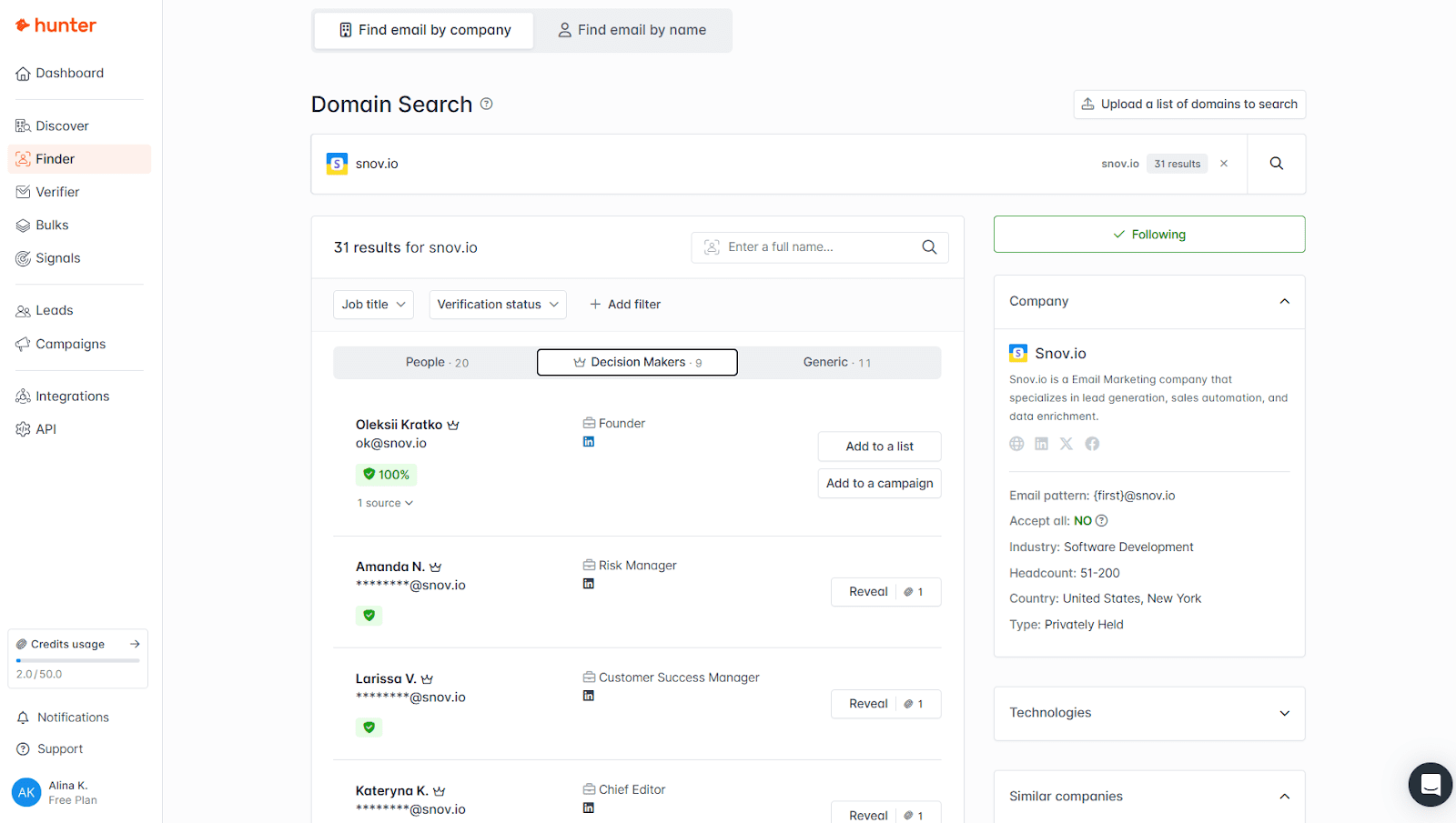 I do recommend Snov.io for teams who want to enhance B2B prospecting. Beyond email finding capabilities, the platform features a database of over 50 million prospects. You can filter them by location, industry, job title, or other criteria, and build a highly targeted lead list.