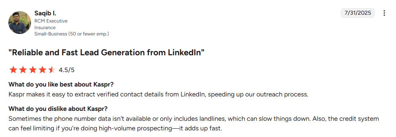 | Kaspr | Chrome extension for LinkedIn prospecting, lead lists, CRM sync | From $59/month* | ✅ | SDRs sourcing contacts directly from LinkedIn |