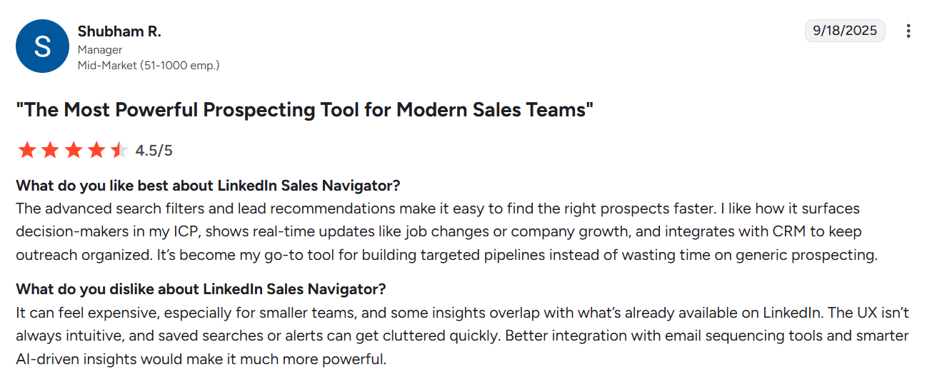 LinkedIn Sales Navigator is widely praised for its numerous filtering options as well as saved searches. People also like real-time alerts that let reps time outreach more effectively. However, many users consider the tool expensive, especially for small teams, noting that you still need additional software for the outreach.