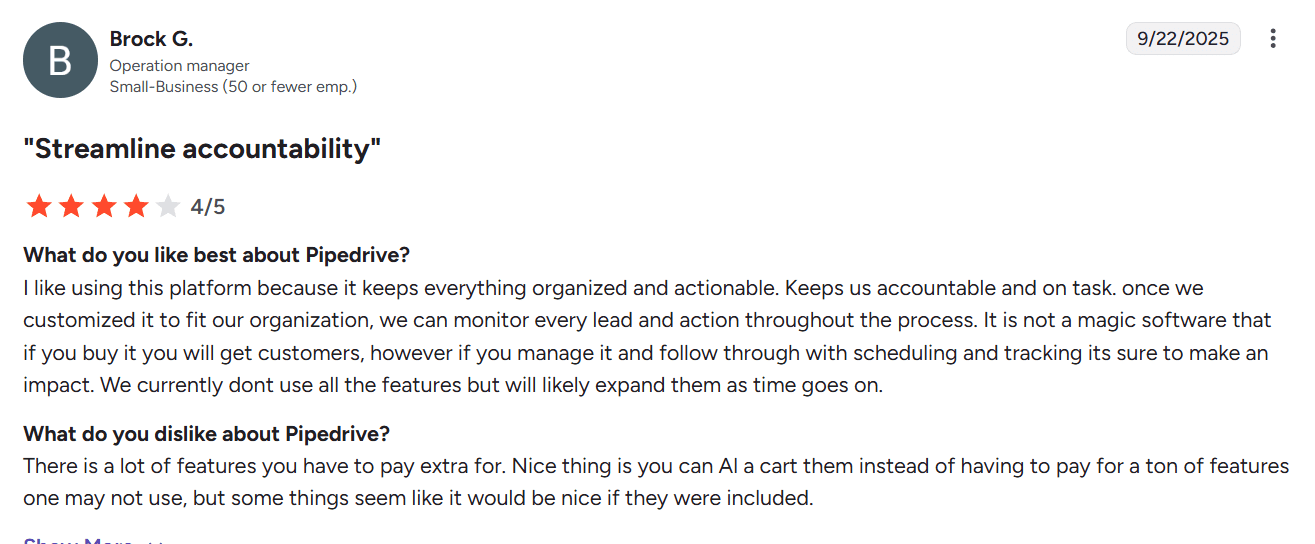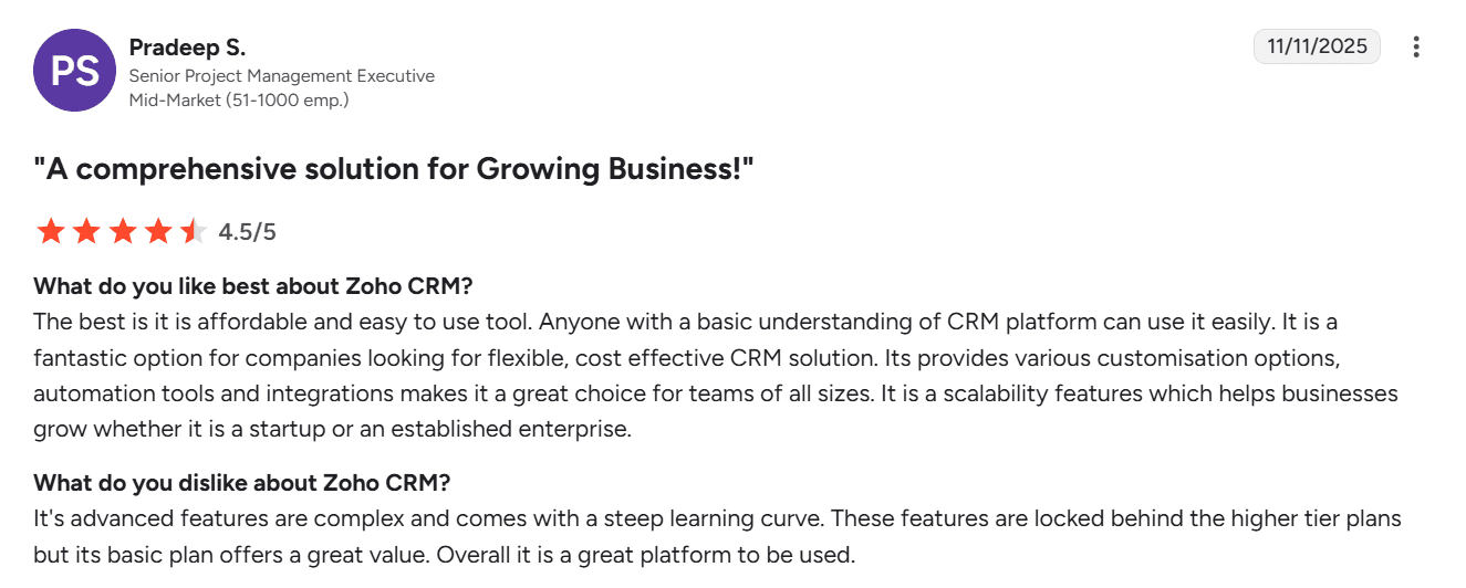People like Zoho CRM for its robust customization options. Many users find the platform easy to use, even though the interface may feel busy at first. However, some reviewers note that advanced functionality comes with a steep learning curve.