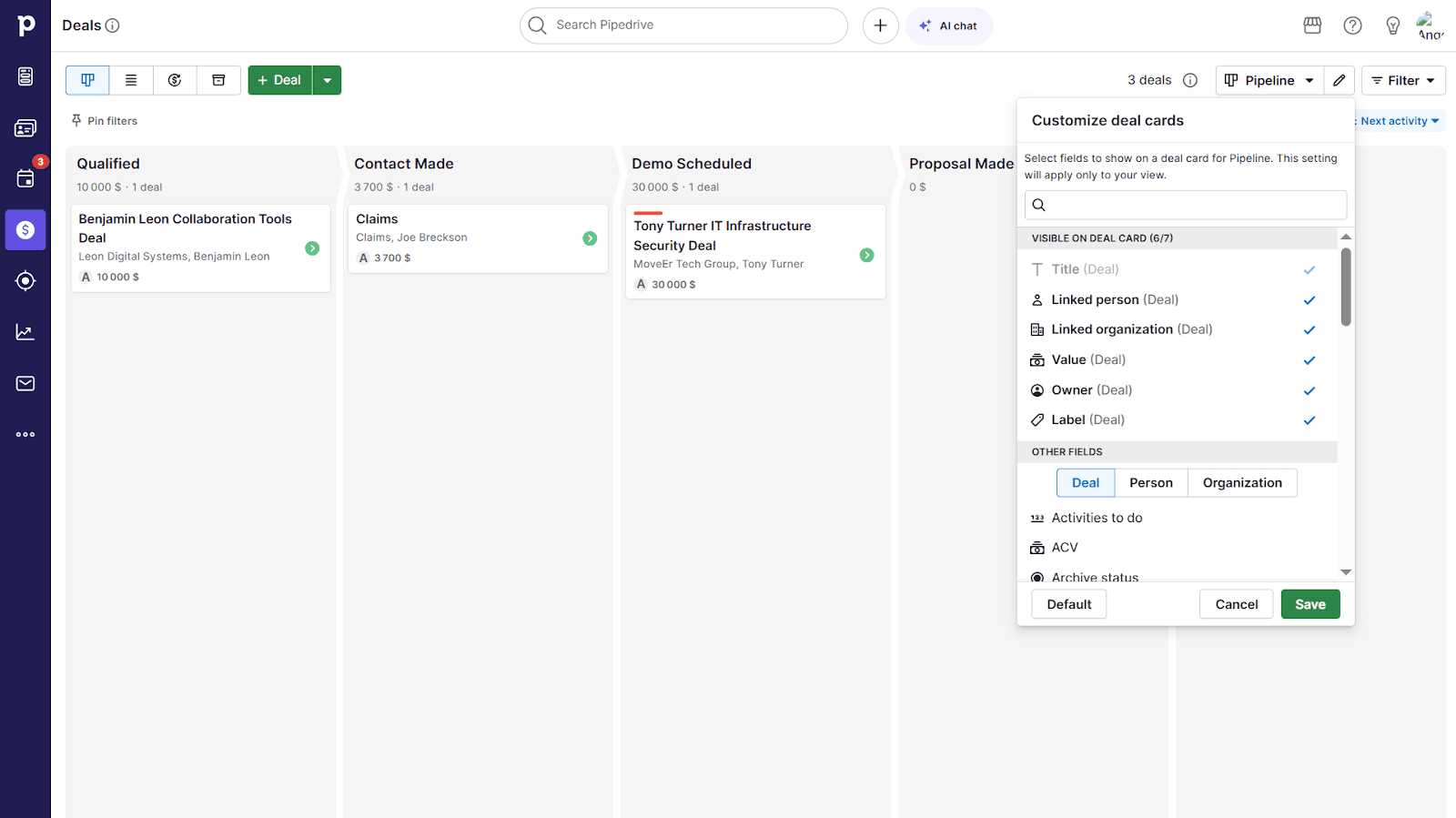 The interface is clean, with all features categorized, making it easy to find the necessary functionality. Another good point is the ability to customize your sales dashboard by applying filters or adding fields. This makes sales pipeline management and deal tracking more efficient.