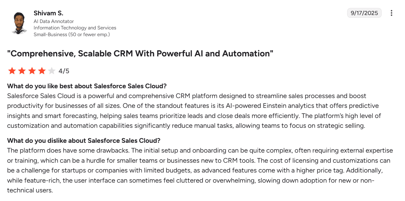 When evaluating B2B sales tools, I also looked at real customer feedback. It helped me assess whether the tool actually fits B2B workflows, what team size it suits, its pros and cons, as well as other nuances. For this research, I’ve used trusted platforms, such as G2 and Capterra.