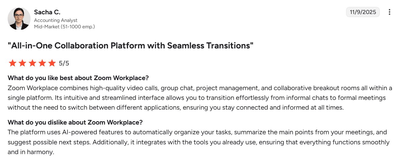 Users praise Zoom for its reliable call quality, easy joining, and different screen-sharing options for organizing sales demos. People also like Zoom’s real-time translation in chats and recording capabilities.