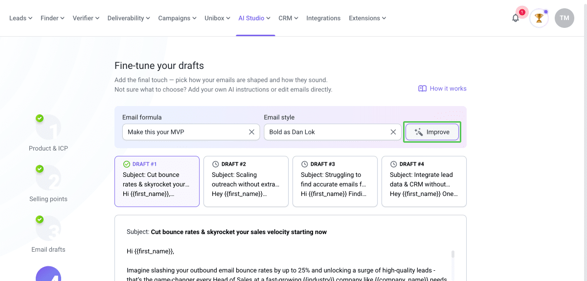 What I also like about Snov.io B2B sales software is its AI email builder, which helps you create highly tailored emails based on your Ideal Customer Profile. All you need is to briefly describe your product, then add details of your ICP, and let the platform generate compelling email templates for you.