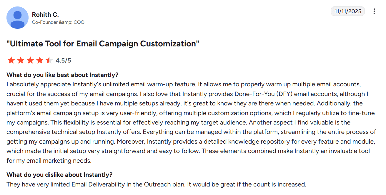 Another disadvantage, in my opinion, is that the platform doesn’t offer automated domain setup. I mean, though Instantly provides the email warm-up, other infrastructure elements are still dependent on manual effort.