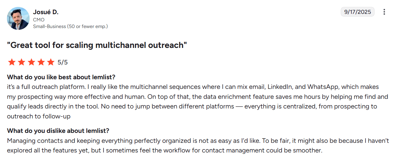 Users consider Lemlist helpful for omnichannel outreach as it covers email, WhatsApp, LinkedIn, and phone touches. Reviewers also like the built-in data enrichment; however, the database information isn’t always up to date. Also, some mention a steep learning curve as you move to contact management features.