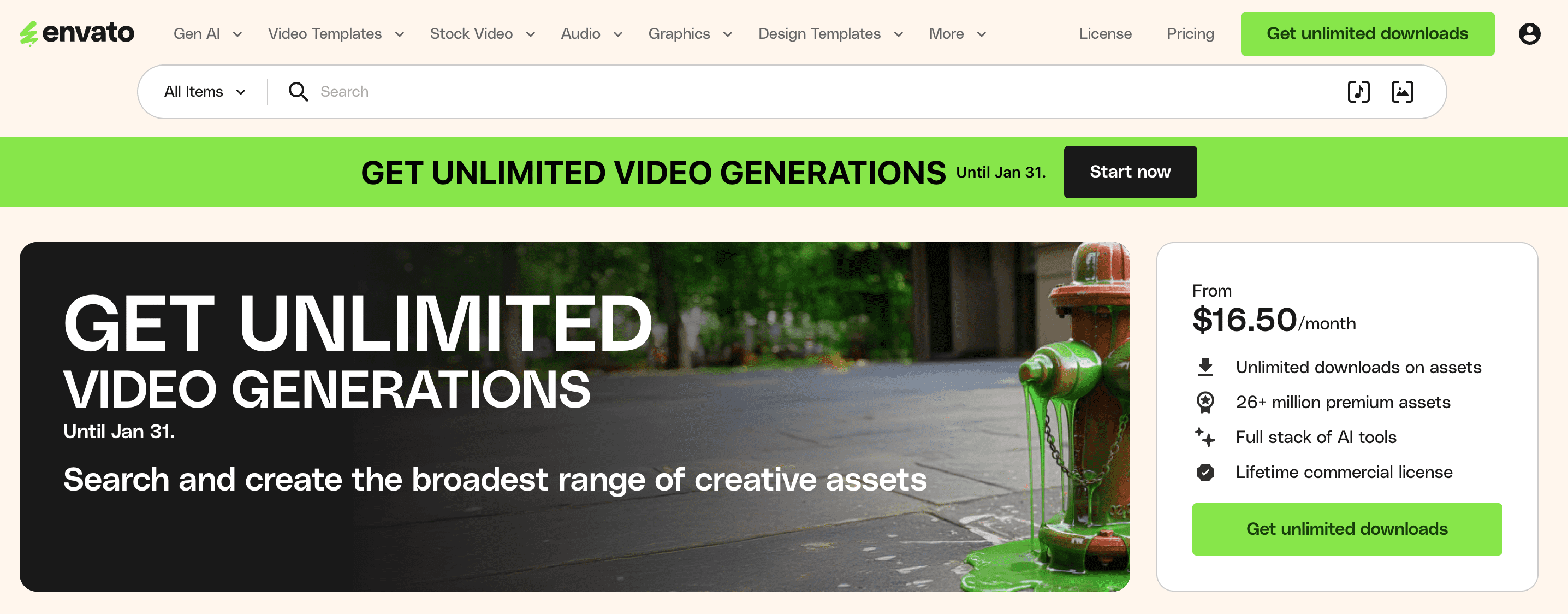 Envato offers a subscription with unlimited downloads of digital assets, including stock photos, videos, music tracks, fonts, graphics, presentation templates, website themes, sound effects, and 3D models.