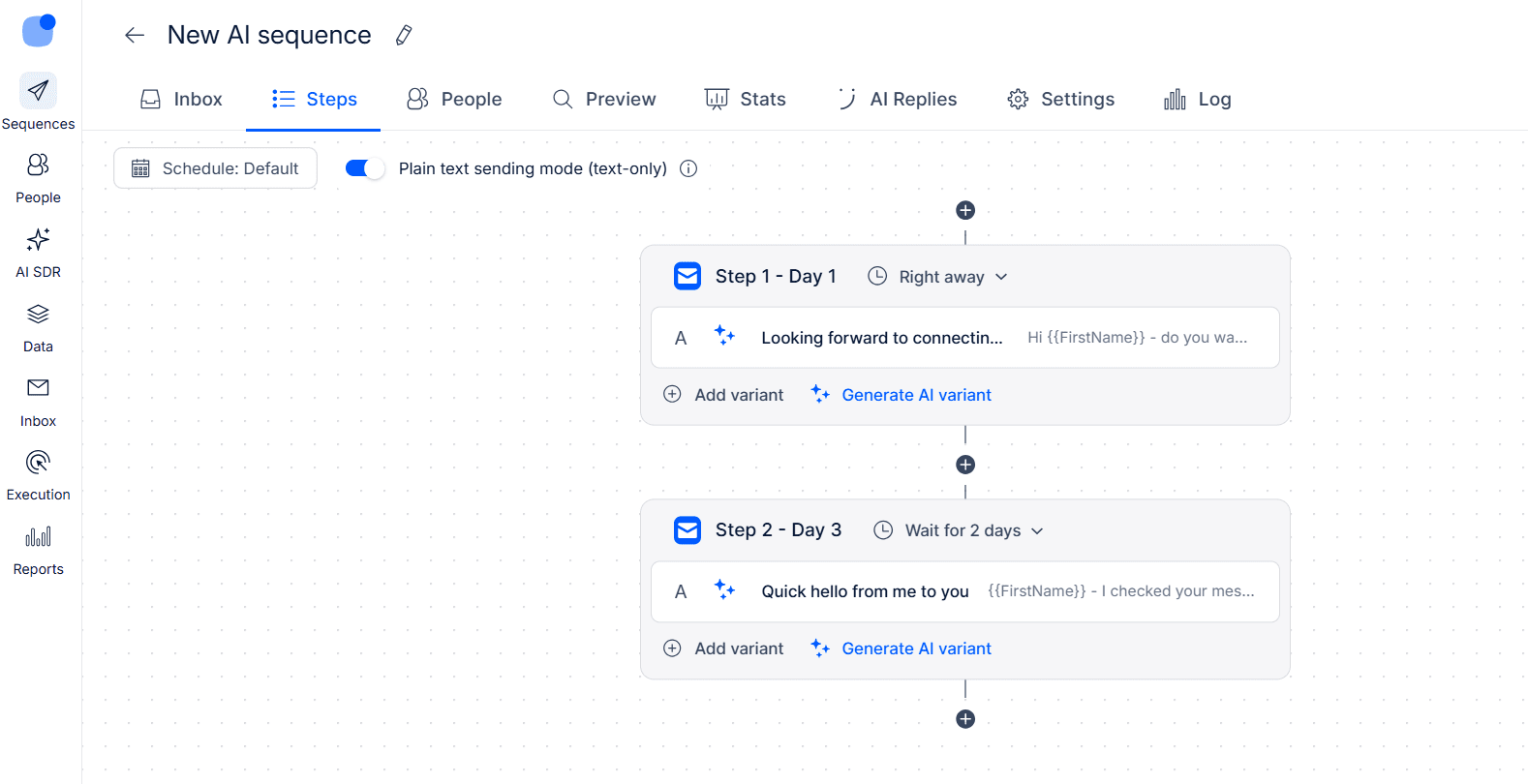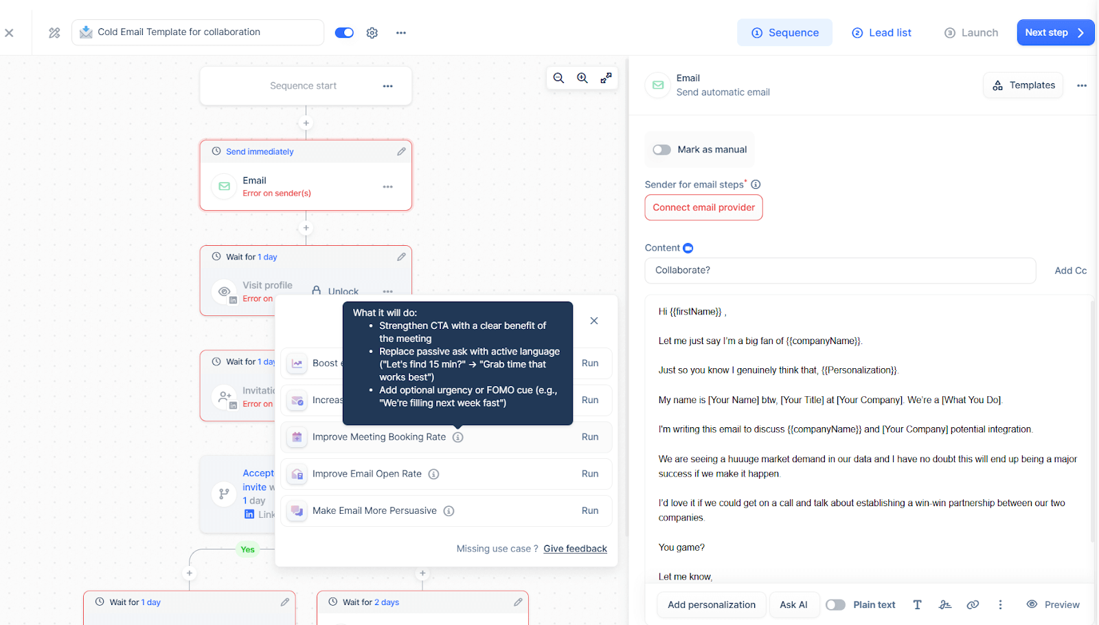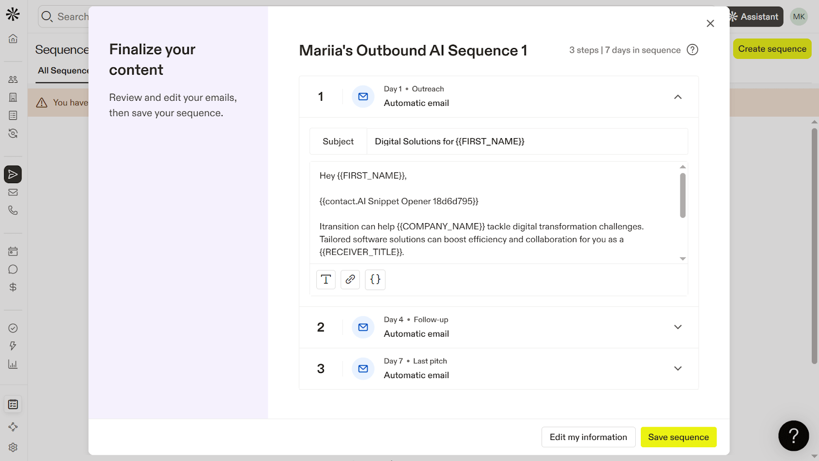 Once everything was set, the AI generated a multistep sequence. A big plus is that I could edit each email both manually and with an AI writing assistant.