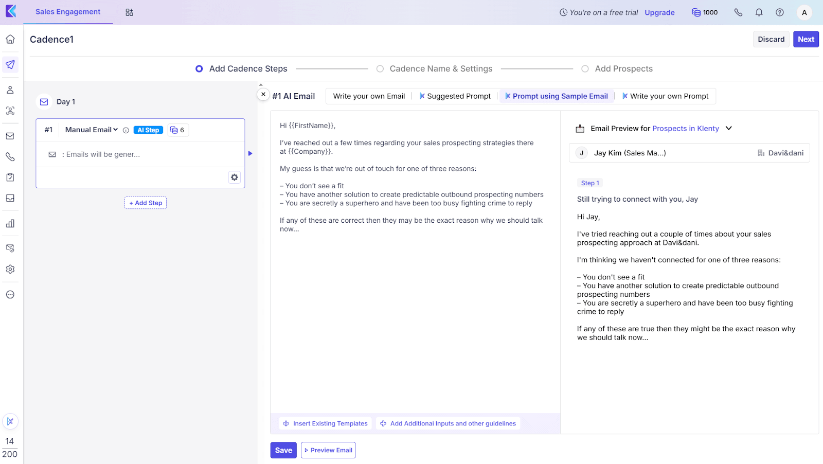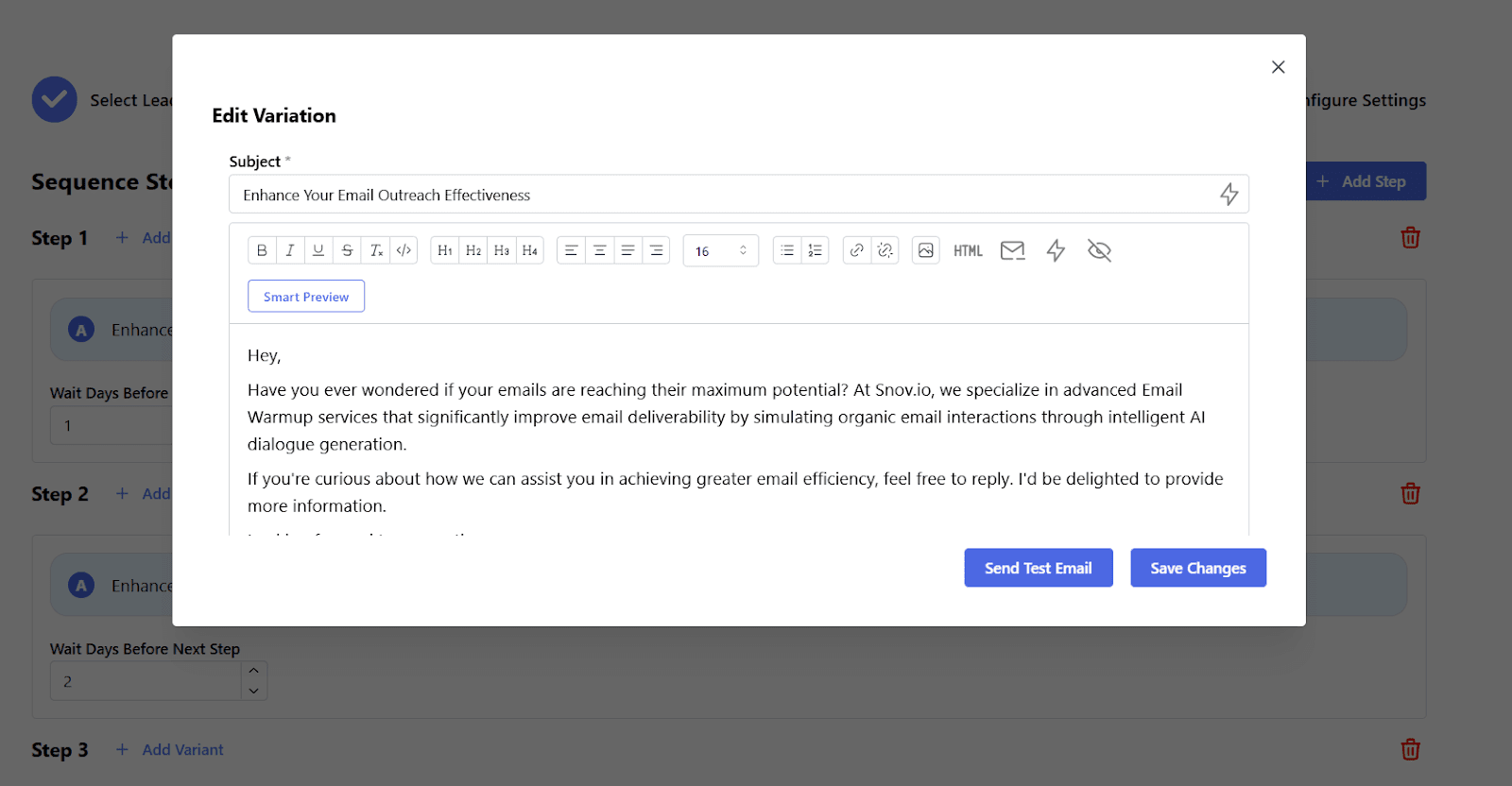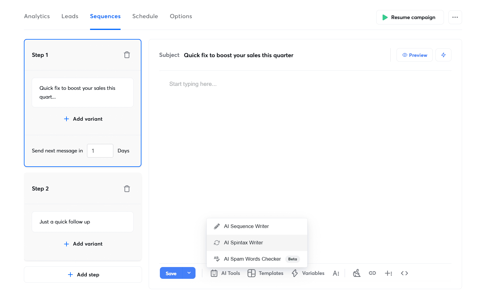 Once everything was set, the AI generated a multistep sequence. A big plus is that I could edit each email both manually and with an AI writing assistant.
