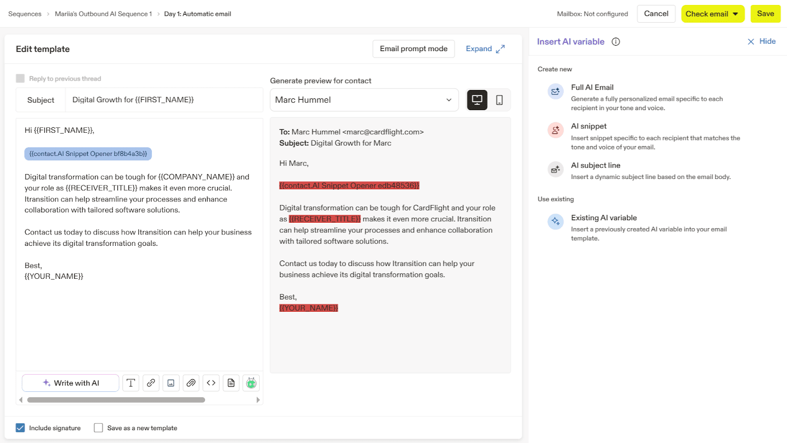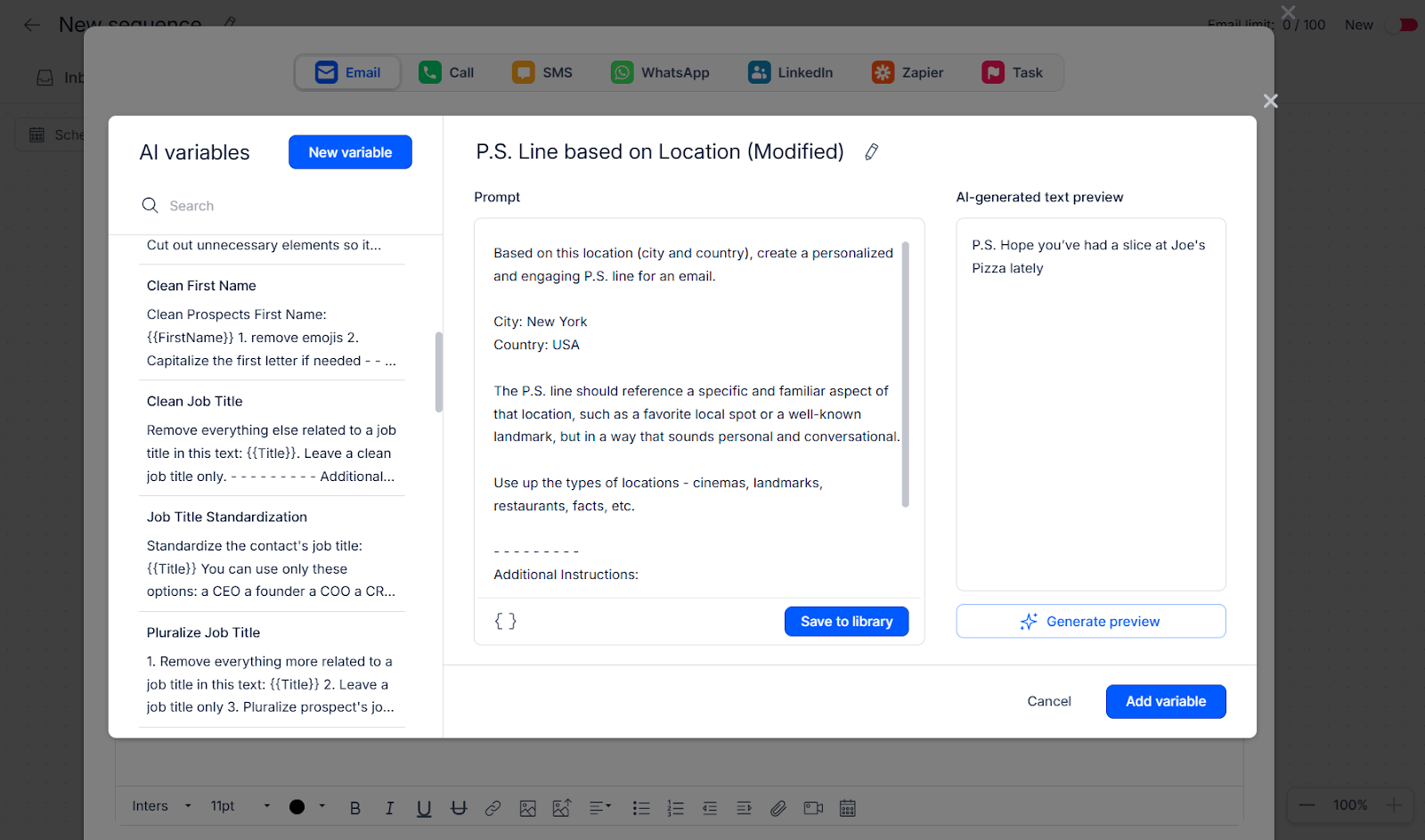 - Personalization variables: Custom AI-generated fields filled automatically to tailor an email for each prospect based on your prompt