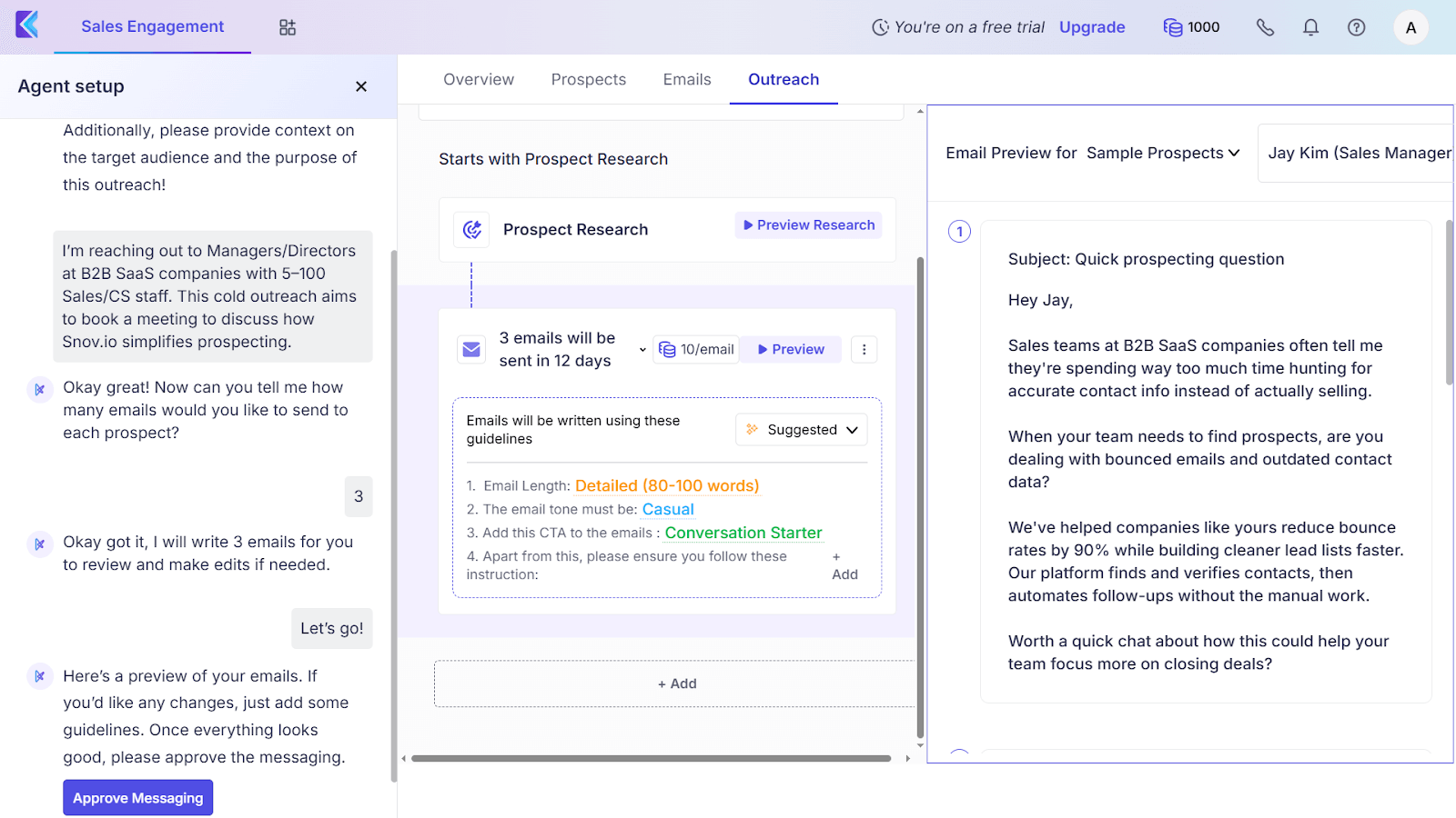 Although the platform offers a customizable prompt sample you can fill with your details, I don’t think it’ll help much if you haven’t clearly defined your ICP, value proposition, and unique selling points. So, you still need to do manual research before generating sequences with the platform’s cold email AI if you want truly meaningful results.