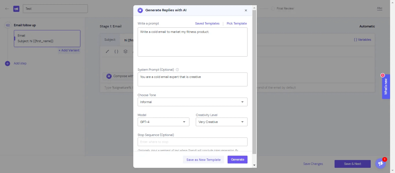 What I liked is that you can generate the sequence within seconds. As for the email copy, it can be generated from custom prompts; subject lines and body text can be customized. Plus, there are several options for tweaking your message with AI variables.