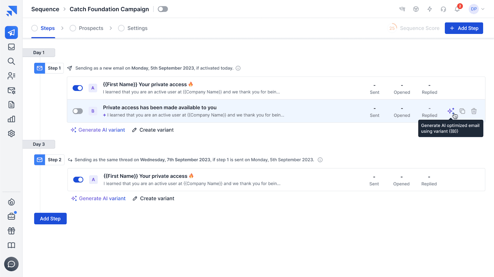 - AI Variants: Multiple email versions generated by the platform’s AI feature