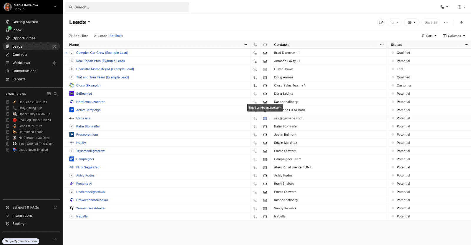 Snov.io is an all-in-one sales acceleration platform. With access to a database of 50+ million company contacts and powerful prospecting tools, you can quickly build verified lead lists, launch personalized outreach campaigns, as well as track every deal from first touch to close.