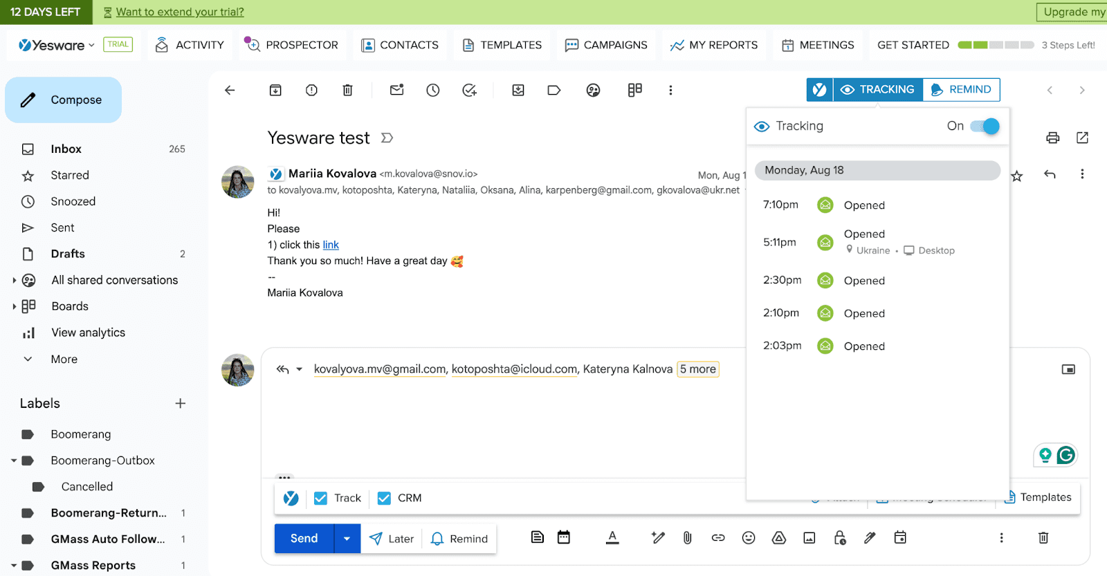 It took me just a few minutes to set up Yesware, so it was easy to start using the tool right away.