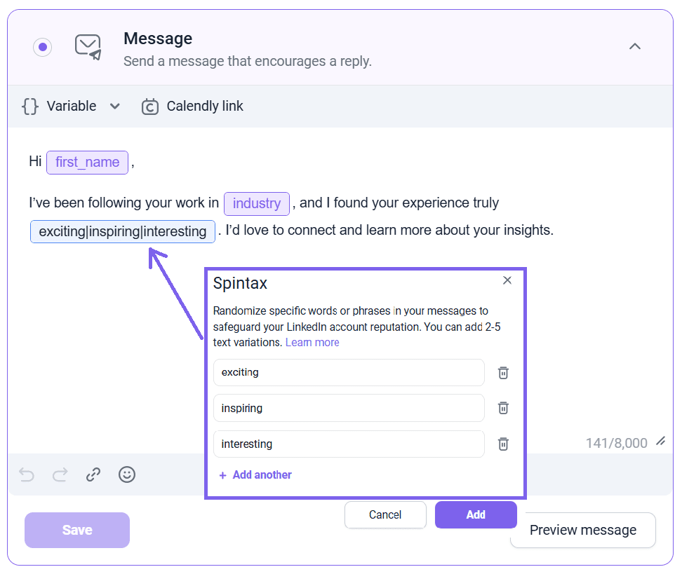 | 💡 Dica bônus: Antes de enviar uma mensagem, interaja primeiro: curta ou comente algum conteúdo da pessoa. Quando for a hora de entrar em contato, personalize em escala: cite o nome, cargo ou empresa. Com o recurso de conteúdo dinâmico e Spintax da Snov.io, você cria variações naturais de texto, fazendo cada mensagem parecer única, mesmo em campanhas automatizadas. |