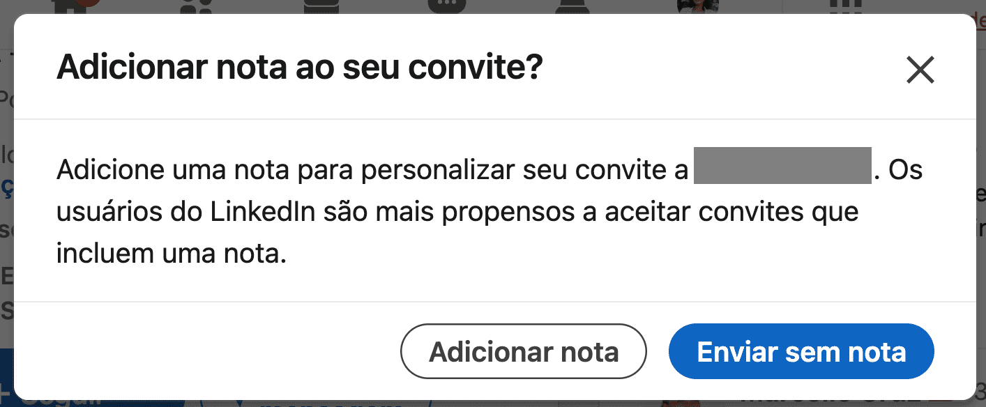 Essa é uma das formas mais diretas de mandar mensagem no LinkedIn sem ser Premium, criando uma primeira conexão genuína com o contato: conecte-se e envie uma mensagem com o convite. Quando você clica em Conectar, o LinkedIn exibe um campo para adicionar uma nota personalizada.