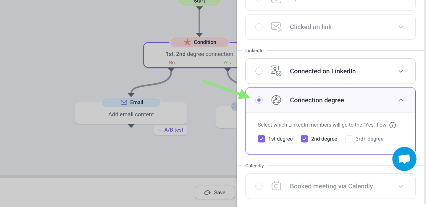 Além disso, é possível adicionar condições e filtros para direcionar melhor suas campanhas, segmentadas por grau de conexão ou comportamento do lead: